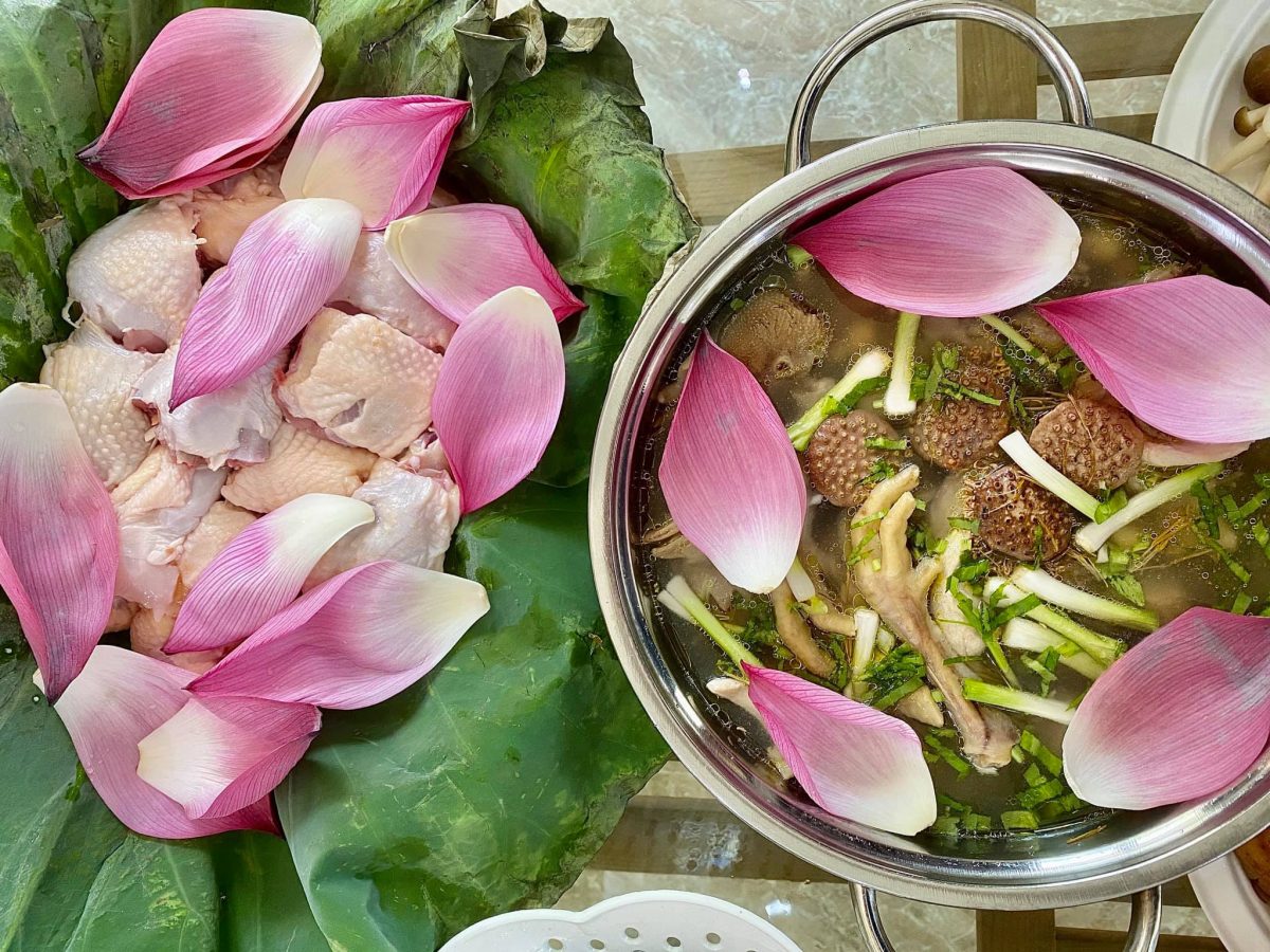 Lẩu gà hoa sen ngọt thanh, kèm theo mùi hương của hoa sen thơm nhẹ, thịt gà dai dai chắc thịt vô cùng hấp dẫn.