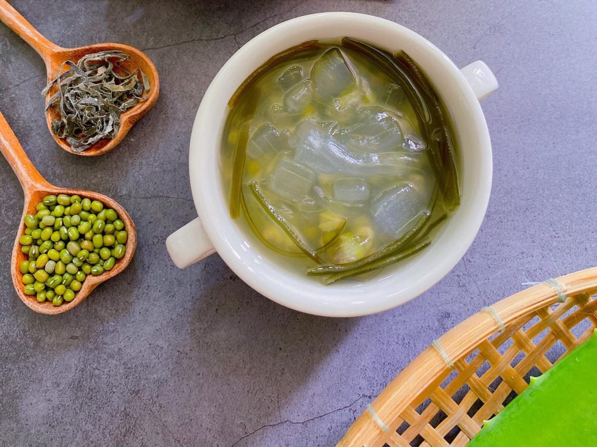 Kết hợp nha đam với đậu xanh kèm rong biển sẽ là món chè giải nhiệt hoàn hảo, vừa giúp thải độc tố trong cơ thể, vừa làm mát và dịu da. Ngoài ra, bạn có thể dùng món chè này như một phương thuốc làm đẹp da không chỉ công hiệu lại cực kỳ ngon miệng.