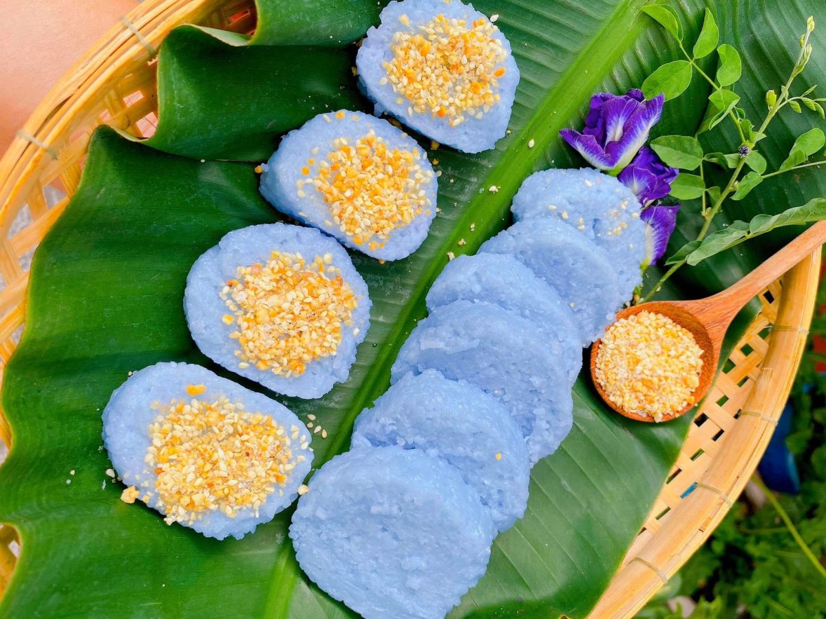 Gạo vo sạch để nước vào nấu như thông thường, nước nấu mình dùng nước hoa đậu biếc nếu có. Khi cơm rút nước cho vài lá dứa vào cho thơm. Cơm chín tắt bếp.
