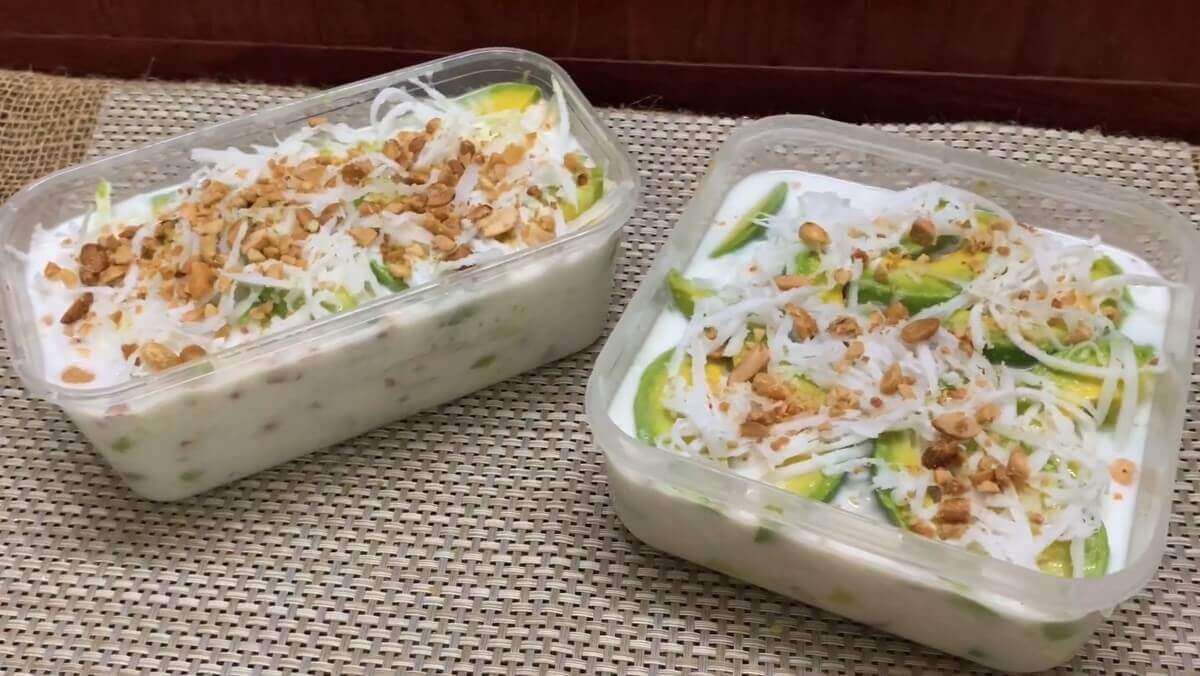 Lần lượt các lớp theo thứ tự như vậy đến khi đầy hộp kem và lớp trên cùng là dừa và lạc.