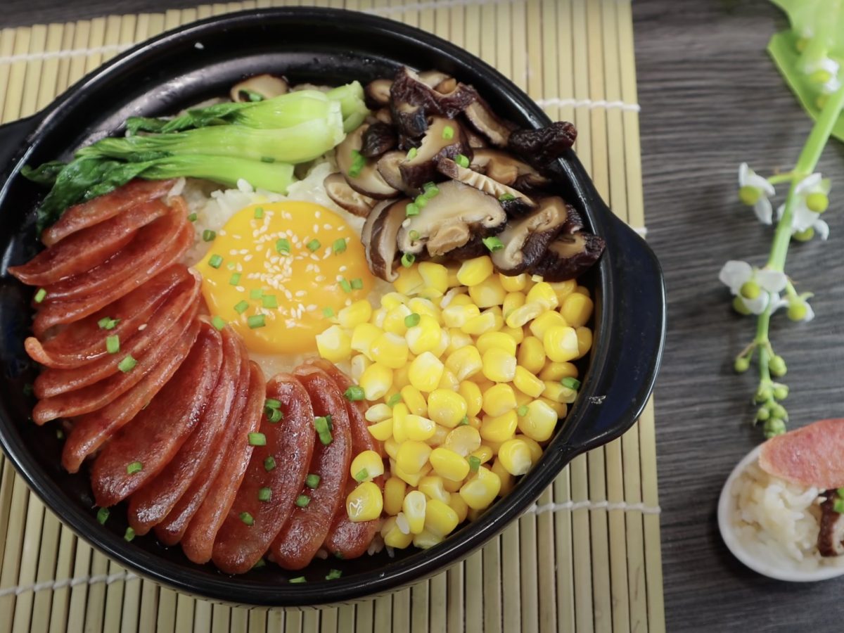 Cơm sau khi nấu được 8 phút thì xếp lần lượt phần bắp vàng, nấm hương, lạp xưởng, cải thìa và đập 1 quả trứng vào.