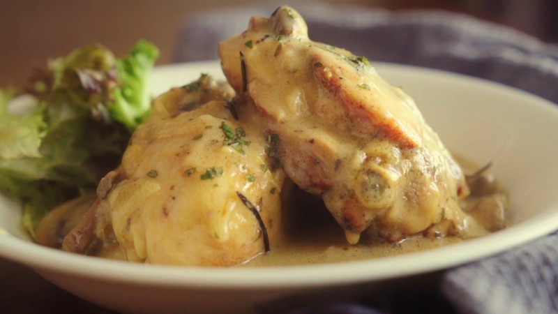 Cho tiếp vào chảo lần lượt các nguyên liệu như tỏi băm, hành tây cắt sợi, 250g nấm mỡ, 3 lá nguyệt quế, 1 nhánh hương thảo, 2 muỗng cà phê bột mì, 1/2 muỗng canh rượu vang trắng, 175ml whipping cream, 1 ít bột rau mùi tây và trộn đều, nấu trong vòng 5 – 7 phút cho đến khi sốt kem sánh lại và thịt gà thấm đều.