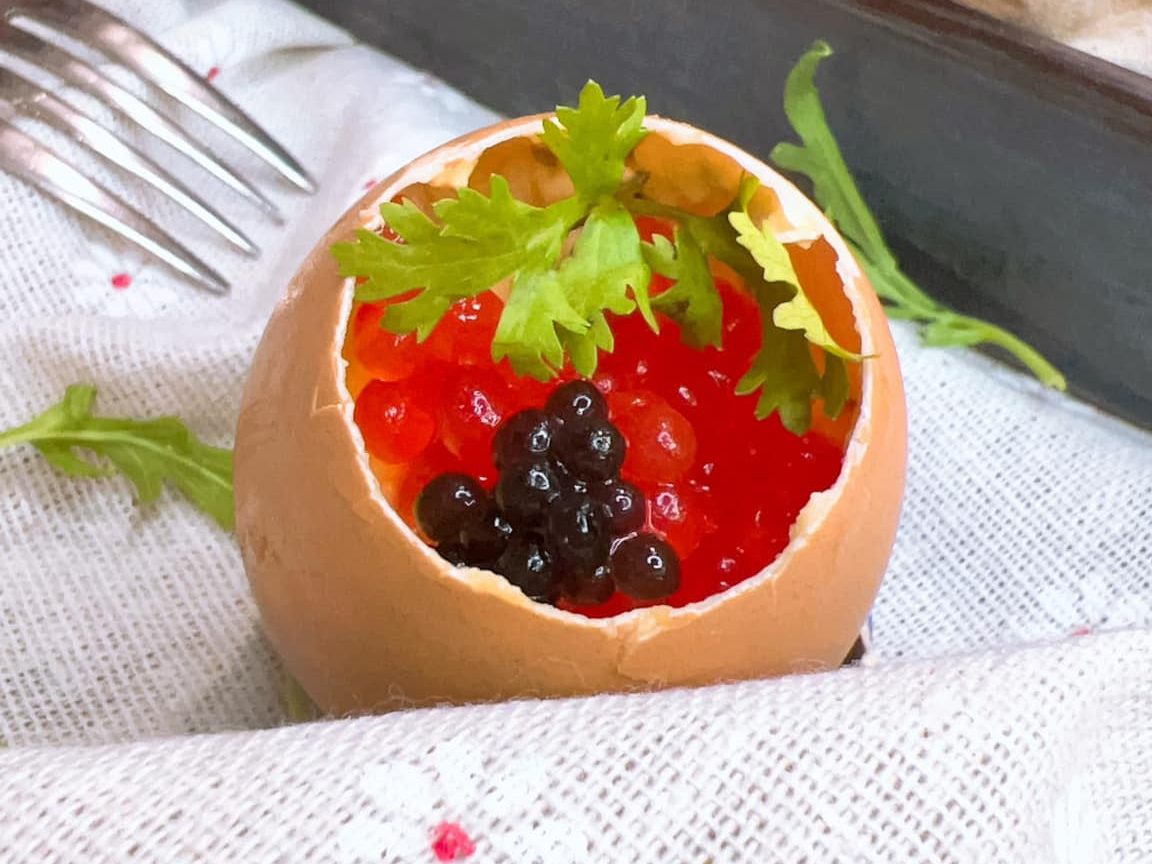 Cho trứng đã đánh bông vào lại trong vỏ trứng, cho lưng lưng thôi để cho trứng cá hồi đỏ và trứng tầm đen vào trang trí cho nổi bật mầu sắc.