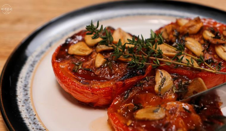 Cà chua đút lò có hương thơm kích thích vị giác. Cà chua mềm, mọng nước, thơm vị tỏi và lá hương thảo. Phết một ít cà chua lên bánh mì giòn và cắn một miếng, bạn sẽ cảm nhận được trọn vẹn vị ngon của cà chua nướng.