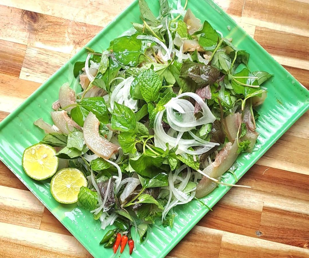 Da bò dai dòn sần sật kết hợp với các vị rau thơm tía tô, diếp cá, húng, vị cay của ớt và chua của chanh đúng là bùng nổ vị giác.