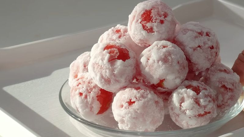 Món kẹo cà chua có màu sắc rất bắt mắt. Từng viên kẹo tròn tròn được áo một lớp đường trắng tinh. Bên ngoài giòn rụm, ngọt ngào. Cà chua tươi, mọng nước, ăn rất lạ và ngon.