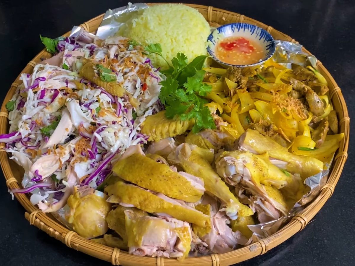 Gà lên mâm với màu sắc bắt mắt, thịt gà luộc chín mềm, thơm vị nghệ. Cơm nấu với nước dùng gà, đậm đà và thơm ngon. Gỏi gà giòn chua ngọt, thịt gà xé phây mềm. Lòng gà xào béo ngọt, hòa quyện vị tự nhiên của hành tây. Món ăn này hấp dẫn với nhiều hương vị và trình bày đẹp mắt. Hãy thử ngay!