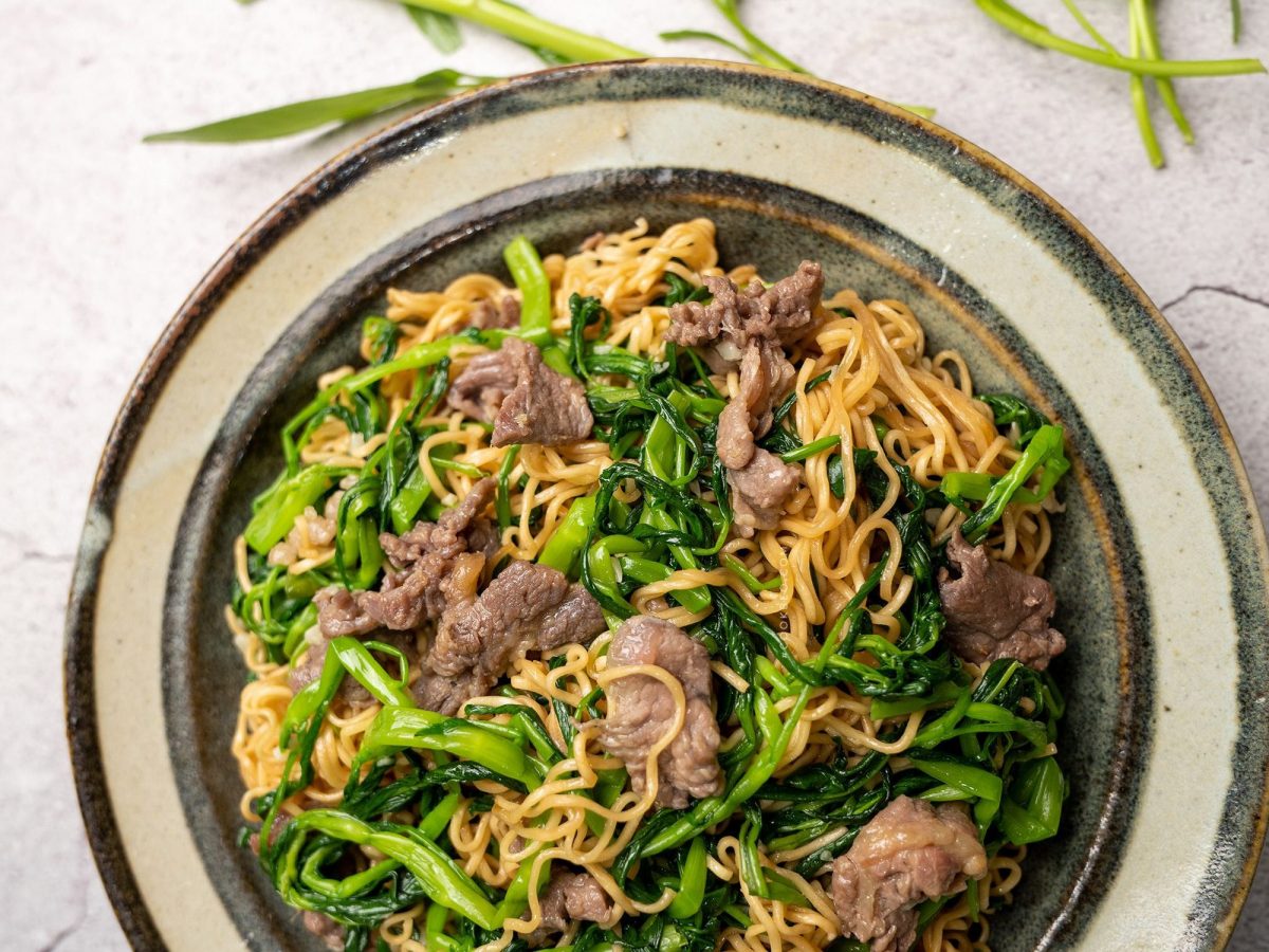 Mì xào rau muống có hương vị hấp dẫn, ăn giòn và không gây ngán, mì tôm không bị nhũn nát gia vị thấm đều. Thịt bò mềm ngọt.