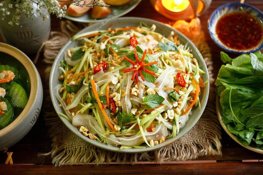Món nộm xoài xanh tai heo giòn ngon, màu sắc hấp dẫn, vị chua ngọt vừa miệng tạo nên món ăn hấp dẫn.