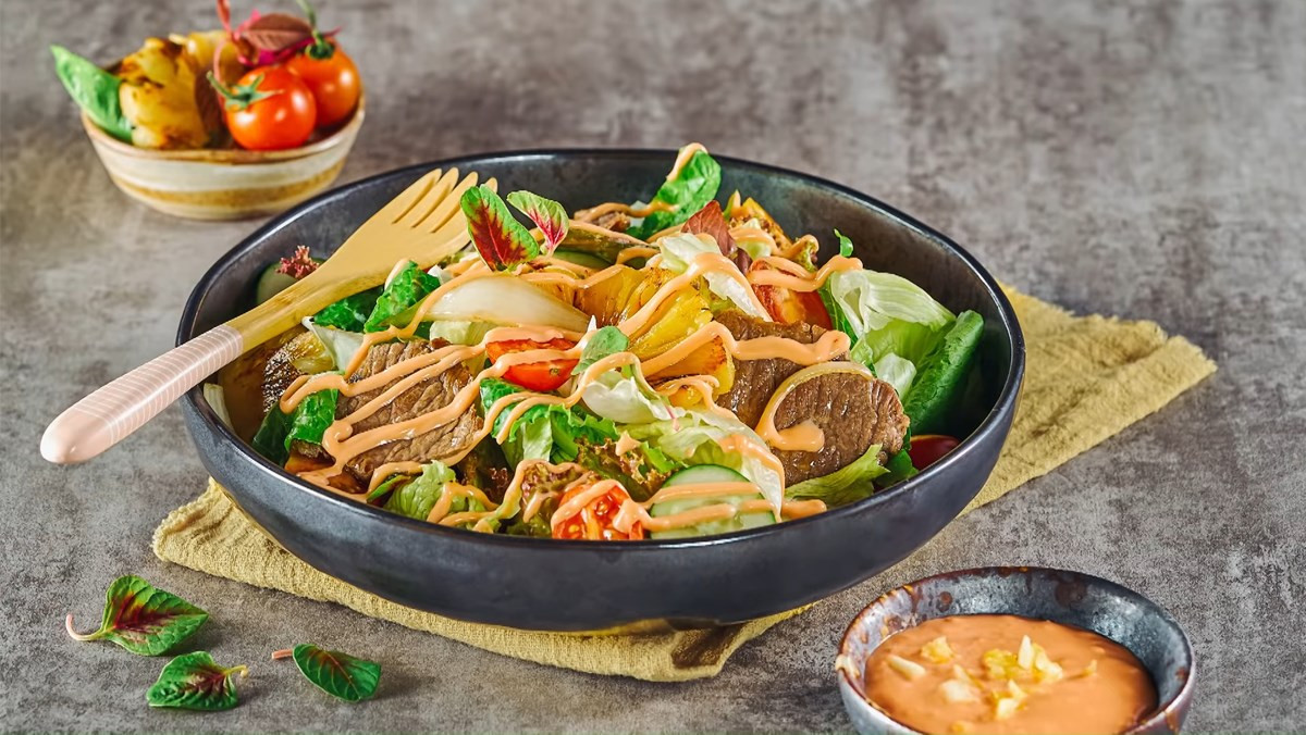 Cho vào tô phần rau củ đã sơ chế, đặt thịt bò lên trên rồi rưới đều nước sốt mayonnaise là hoàn tất.