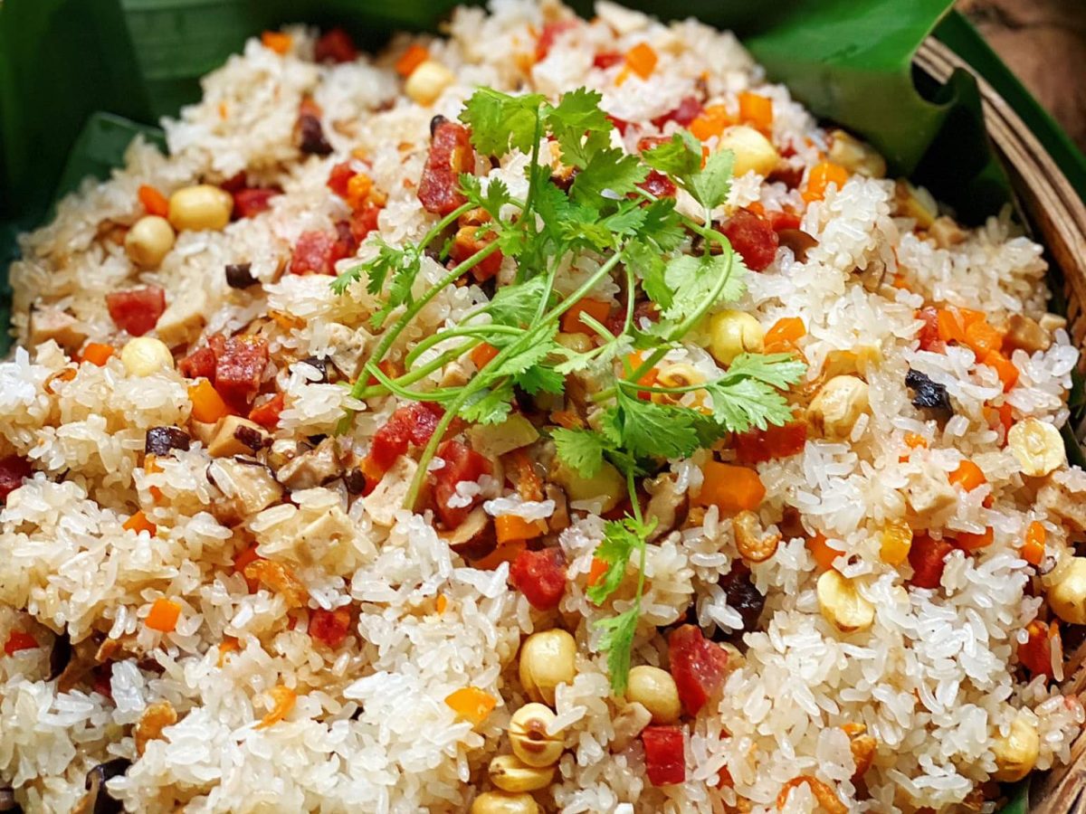 Xôi nóng hổi, từng hạt căng bóng, dẻo thơm, để lâu vẫn rền dẻo. Thoang thoảng thơm mùi lá dứa, phần tôm khô, lạp xưởng chút mằn mặn từ xì dầu quyện với ngọt nhẹ từ cà rốt và chút bùi bùi từ hạt sen làm nên mỹ vị khó quên.