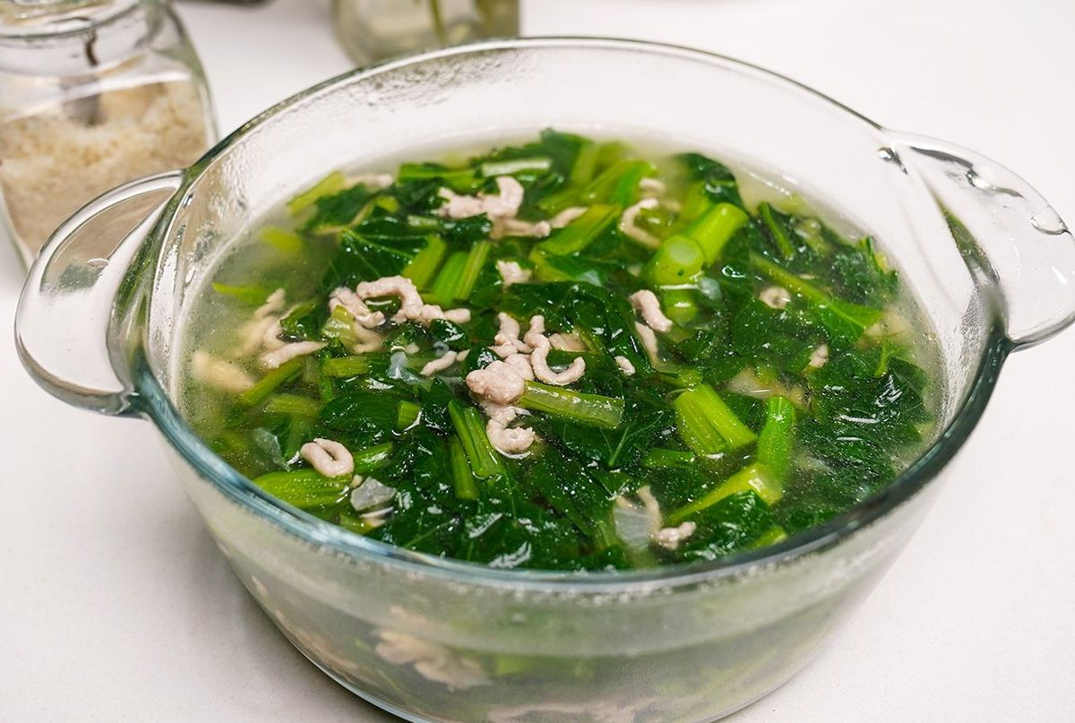 Canh cải ngồng thịt băm có màu sắc bắt mắt, rau cải giữ được màu xanh tươi, kết hợp với thịt băm cực kì ngọt nước và đậm đà