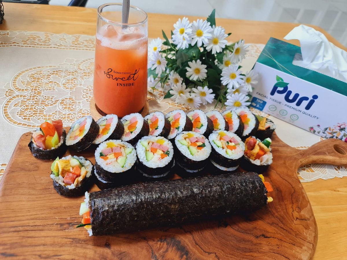 Món cơm cuốn sử dụng nguyên liệu và rau củ đa sắc màu bắt mắt. Thêm một chút kimchi ăn kèm thì món cơm cuốn sẽ đúng chuẩn vị Hàn hơn nhé.