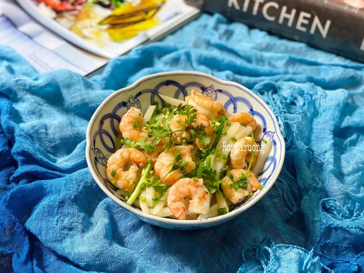 Vị ngọt thanh từ tôm cùng với vị ngọt thanh mát từ củ sắn làm món ăn trở vừa đẹp mắt, vừa ngon miệng.