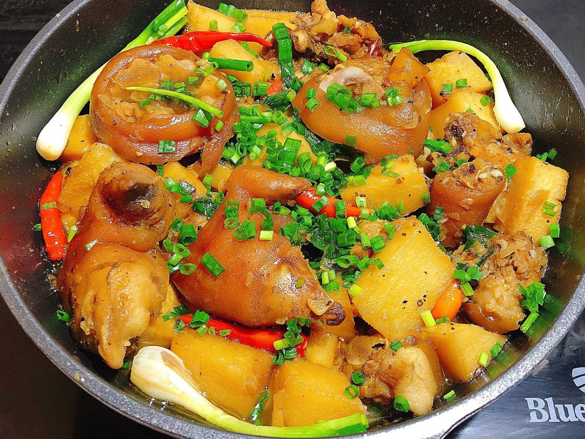 Chân giò ninh mềm, ăn kèm với măng củ bùi bùi, giòn giòn, nước dùng đậm đà rất đưa cơm.