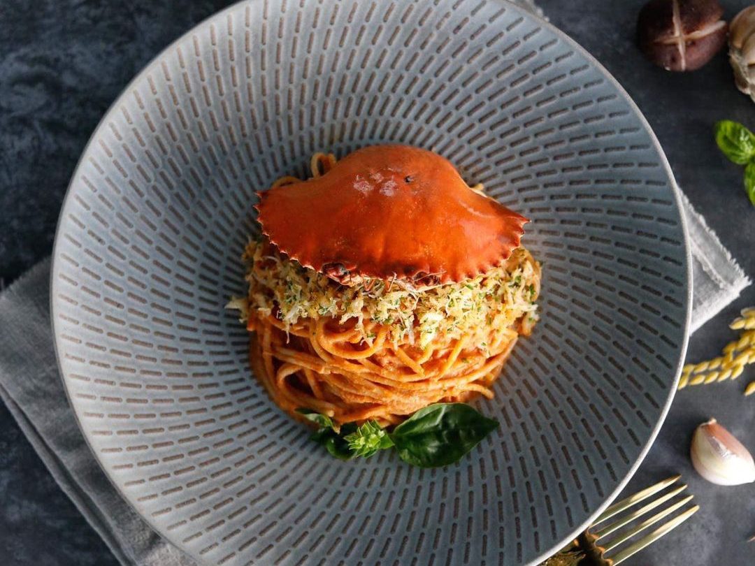 Mỳ spaghetti cua là một một ăn kết hợp với thịt cua tươi cà mau cùng với sốt kem trứng muối cà chua với vị beo béo mặn mặn của trứng vịt muối, hạt thông, hòa quyện với vị giòn sần sật của củ hồi thơm ngon cùng với tiếng nổ lách tách trong miệng từ trứng tôm ebico.
