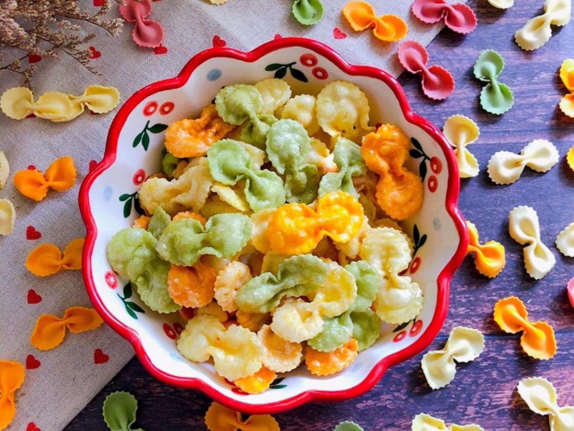 Nui chiên bơ đường cực hấp dẫn với màu sắc vô cùng bắt mắt hòa quyện với vị béo của bơ và ngọt của đường.