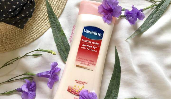 Dưỡng Thể Vaseline Healthy White Perfect 10 chứa AHA và Pro-retinol giúp da trắng sáng và mịn màng. Mùi hương nhẹ nhàng và giữ khá lâu trên da. Texture thấm nhanh và không gây bết dính. Nuôi dưỡng da từ sâu bên trong, giúp da trắng lên trông thấy, làm đều màu da, giảm vết thâm, mềm mịn & săn chắc.