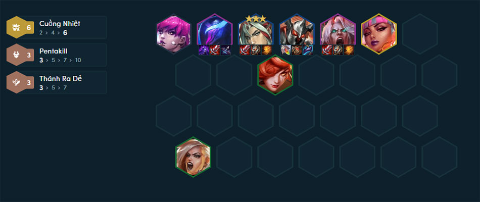 • Tộc Hệ kích hoạt: 6 Cuồng Nhiệt, 3 Pentakill, 3 Thánh Ra Dẻ.