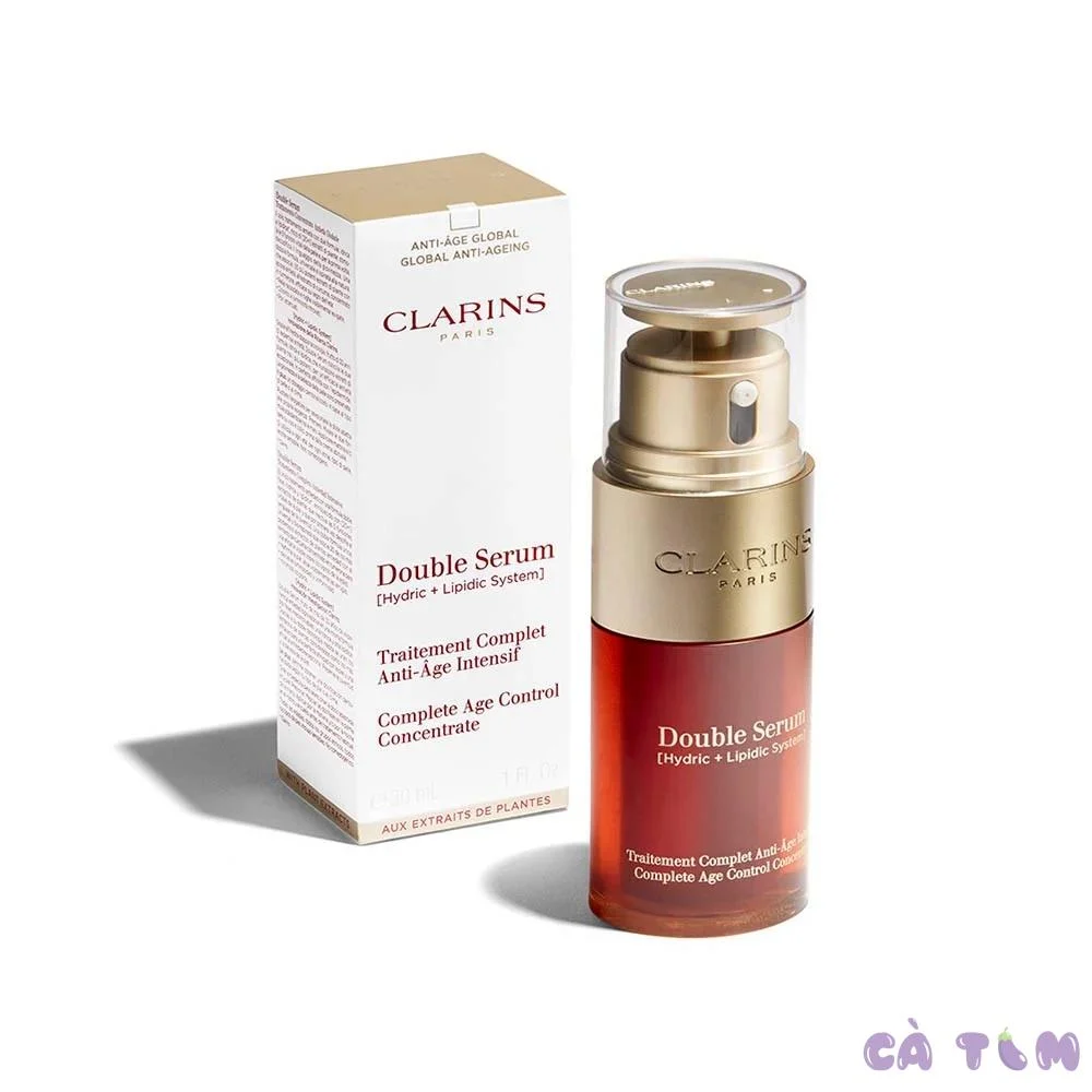Tinh Chất Ngăn Ngừa Lão Hóa Clarins Double Serum từ thương hiệu cao cấp Clarins của Pháp giúp giữ ẩm và làm mềm da, tăng khả năng làm săn chắc da cực kì hiệu quả. Đồng thời, thúc đẩy quá trình tổng hợp collagen và góp phần thúc đẩy dinh dưỡng cho tế bào da căng tràn sức sống. Sản phẩm độc đáo với chất gel 2 trong 1, chỉ với 1 lần nhấn, lượng tinh chất từ 2 ống riêng biệt sẽ được bơm ra và hòa trộn với nhau. Mang lại cho bạn bước dưỡng tinh chất hoàn hảo nhất.