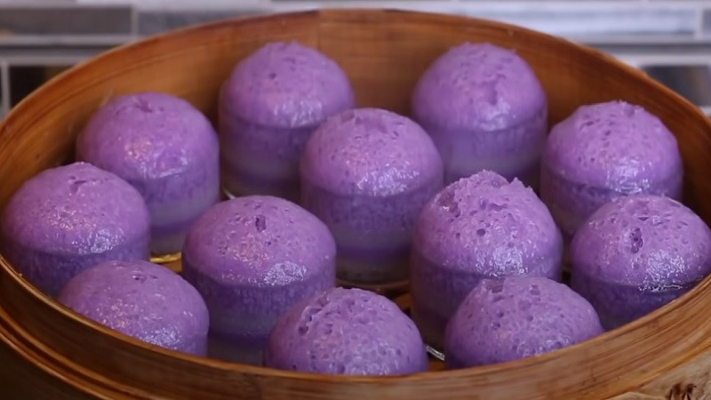 Phần bột sau khi đã hoàn thiện thì bạn tiến hành cho vào khuôn, sau đó đem đi hấp trong khoảng 4 – 5 phút. Sau đó bạn cho phần lớp bột tím lên và trải đều ra, sau đó tiếp tục hấp trong khoảng 3 phút.